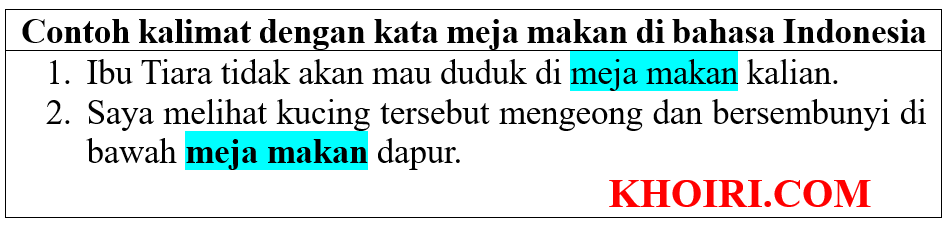 Meja makan merupakan salah satu perabotan yang ada di dalam rumah tangga. Berikut adalah 28 contoh kalimat dengan kata meja makan di bahasa Indonesia, beberapa kalimat di bawah menggunakan kata meja makan sebagai kalimat tanya apabila saudara mempunyai pertanyaan silakan tulis melalui kolom komentar di bawah.