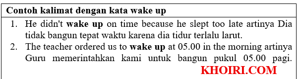 Wake Up artinya bangun tidur. Kata wake up merupakan bentuk kata kerja. Kata wake up bisa berubah menjadi waking up, apabila menggunakan tenses present continuous tense. kata wake up juga berubah menjadi wakes up, apabila subjeknya adalah orang ketiga tunggal, seperti (he, She, It, Nama Orang).