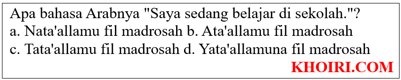- Bahasa Arabnya “Saya sedang belajar di sekolah.” adalah Ata’allamu fil madrosah (أَتَعَلَّمُ فِى الْمَدْرَسَةِ)